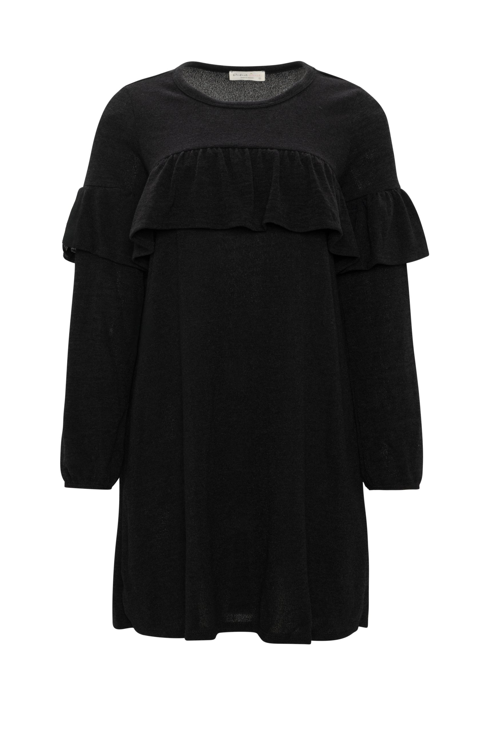 This elegant black dress features a soft and comfortable fabric with a stylish ruffle detail across the chest and sleeves. The relaxed fit and lightweight material make it perfect for casual outings or semi-formal occasions. The round neckline adds a touch of simplicity, balancing the overall design.