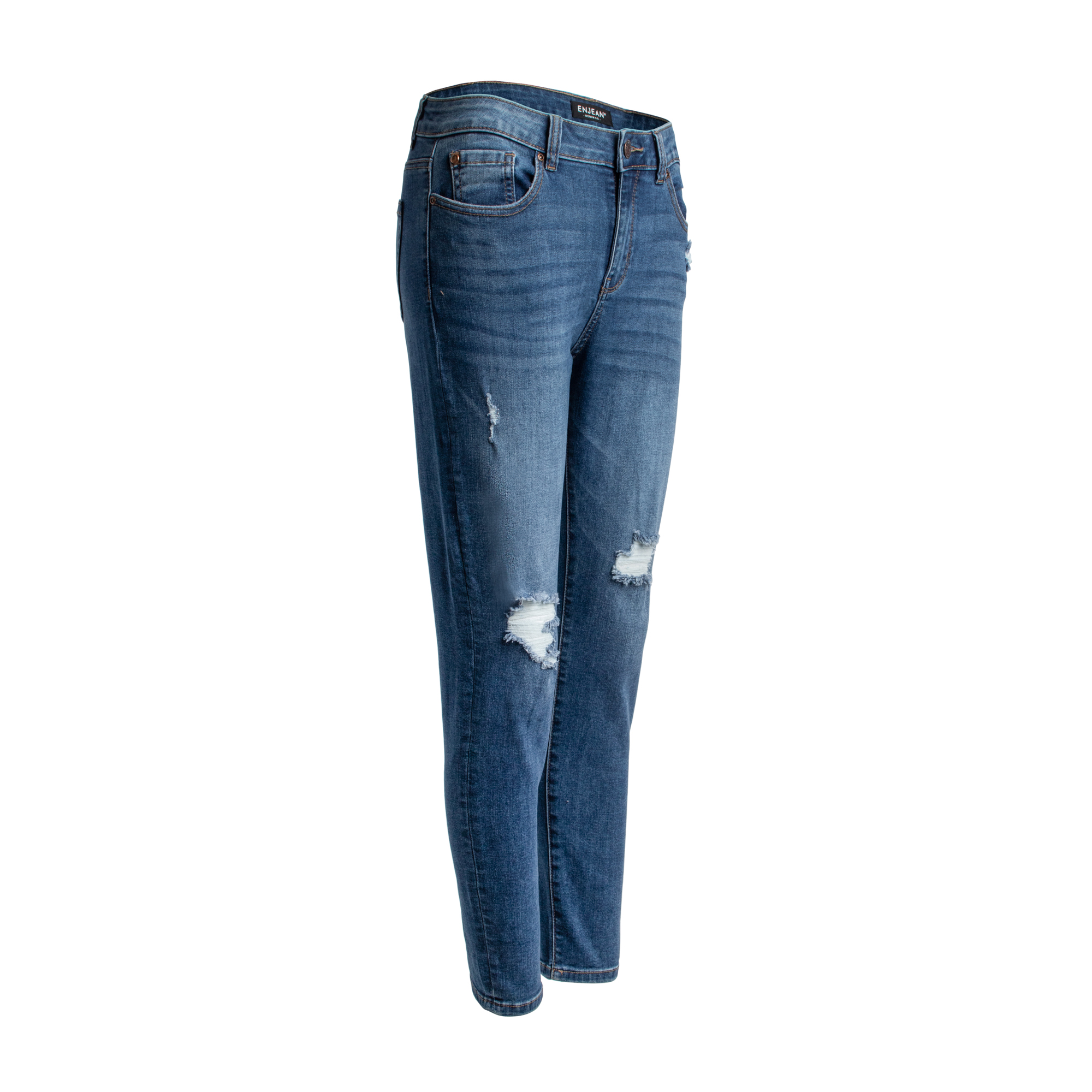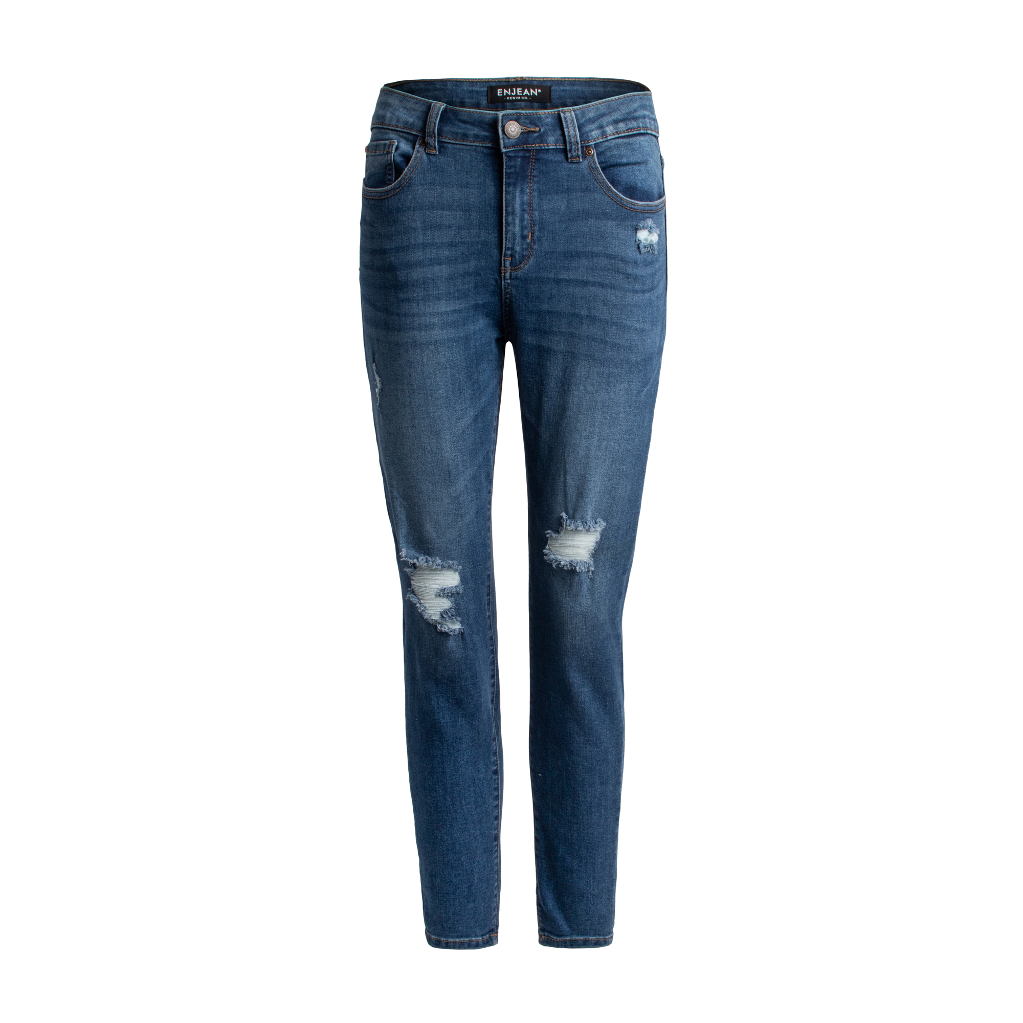 Mettant en vedette une fermeture avec bouton simple au devant et un look légèrement vieilli. Aux genoux, ce jean à taille haute est absolument un must pour votre garde robe! Pour un look impeccable, agencez- le avec une blouse ou un chandail et des bottillons!